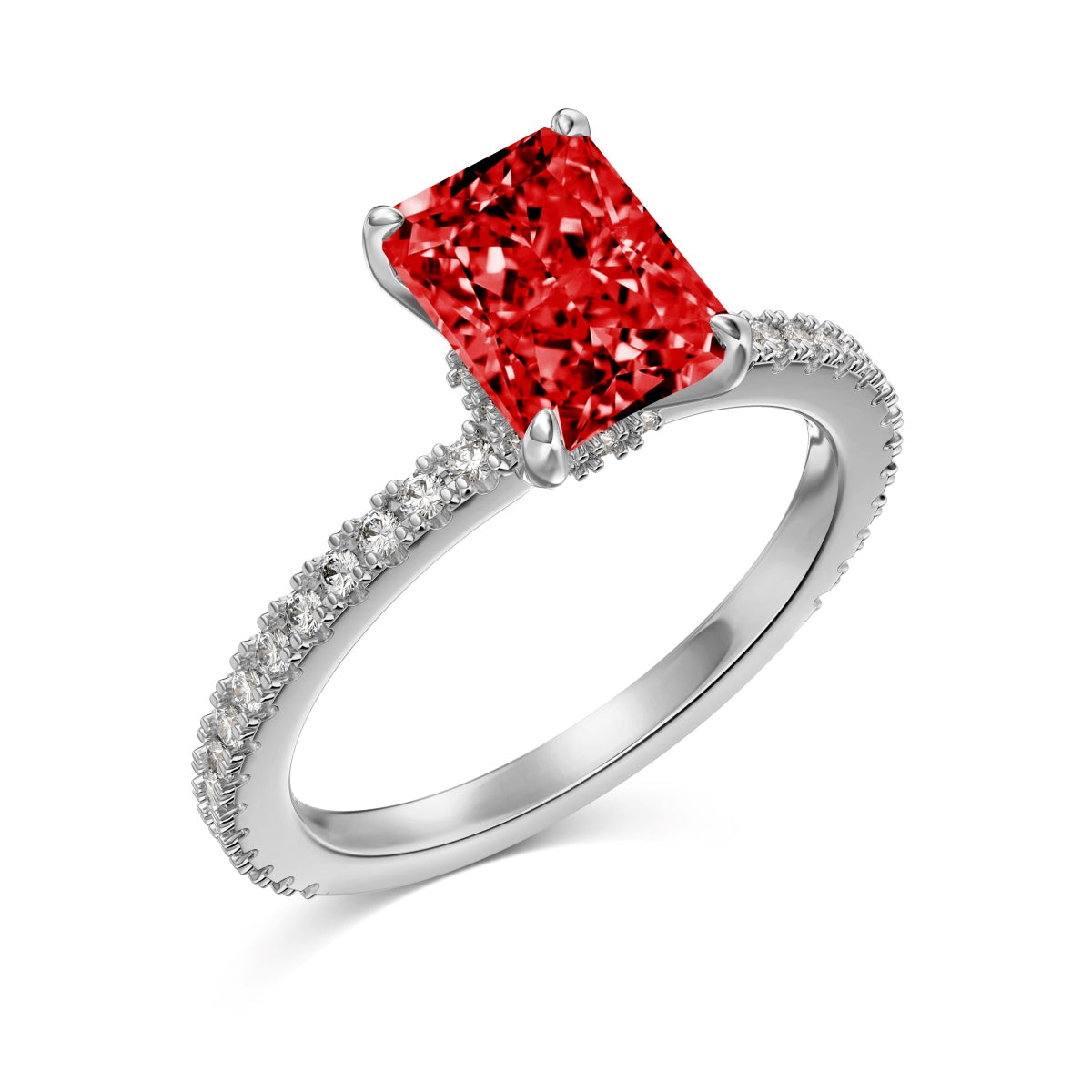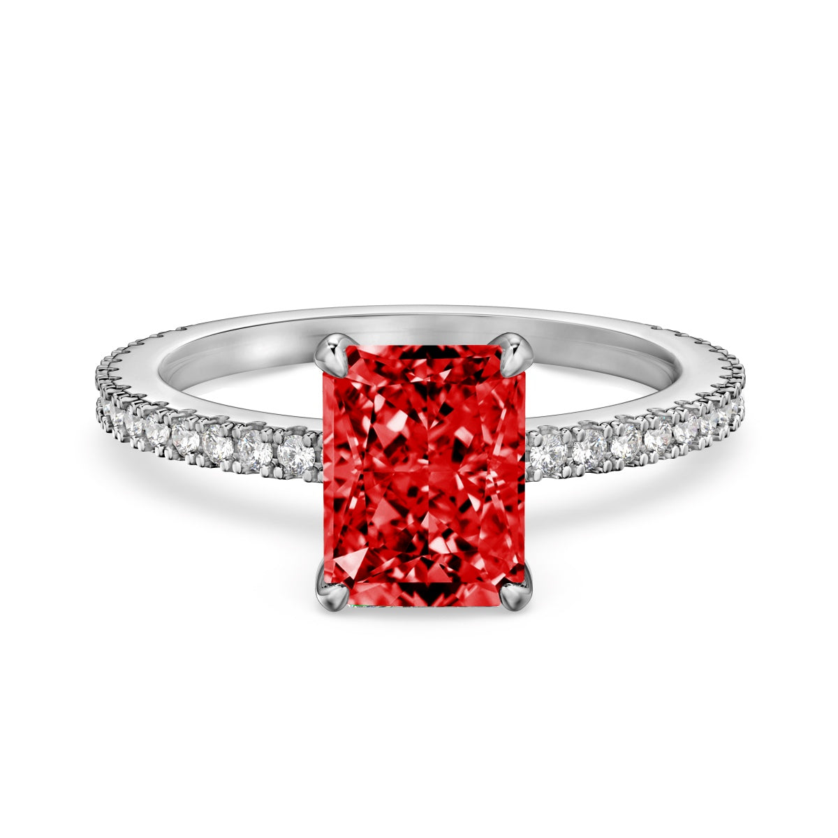 Argento 925 rodiato.Pietra centrale: cubic zirconia 6x8mm taglio radiant di qualità 8A;Pietre sulla fascia: cubic zirconia taglio tondo di qualità 5A.
