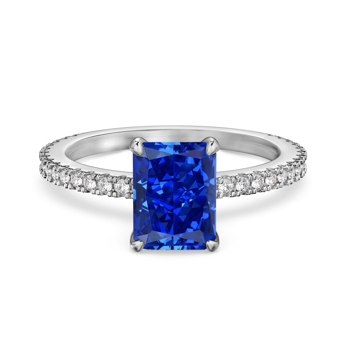 Argento 925 rodiato.Pietra centrale: cubic zirconia 6x8mm taglio radiant di qualità 8A;Pietre sulla fascia: cubic zirconia taglio tondo di qualità 5A.