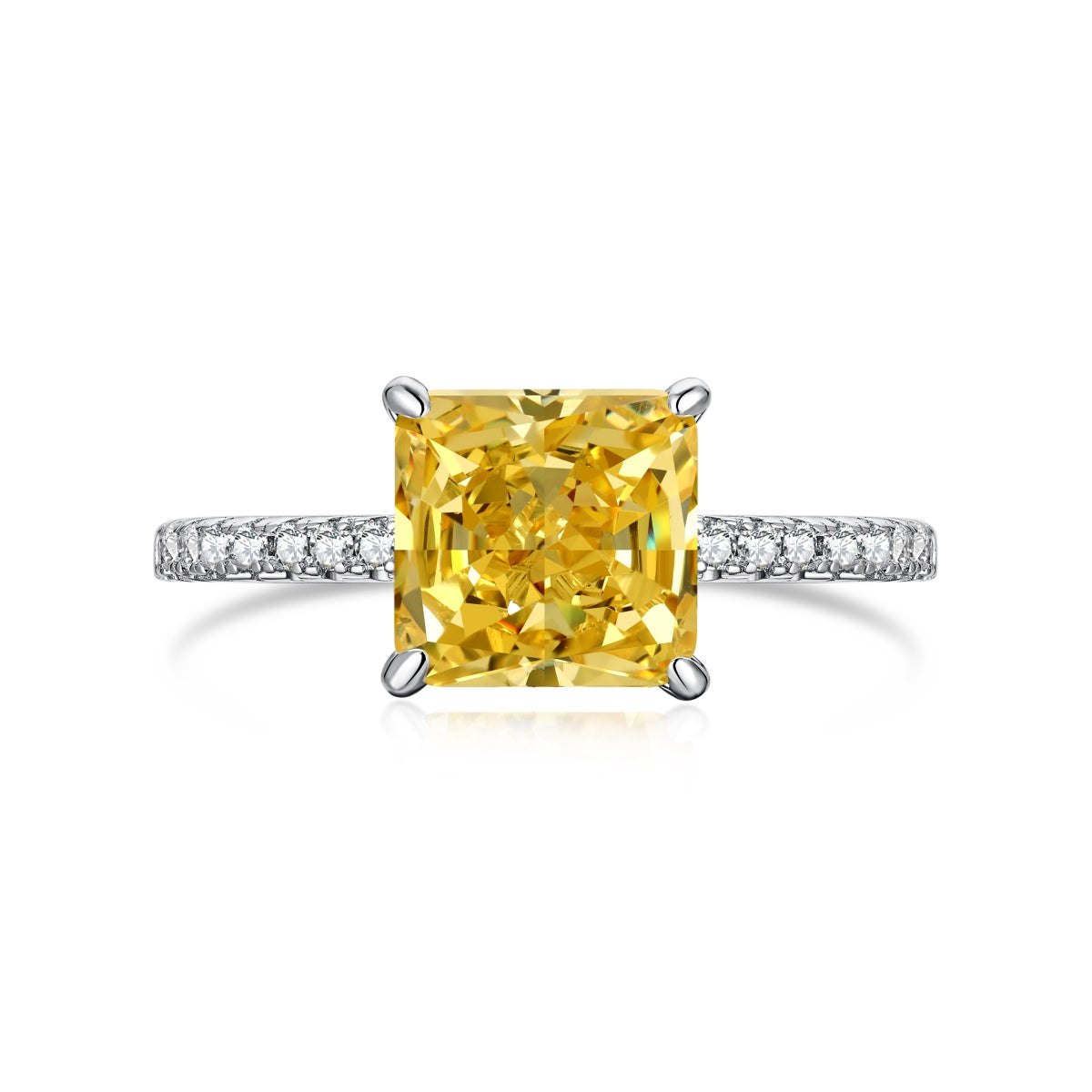 Argento 925 rodiato.Pietra centrale: cubic zirconia taglio radiant (forma square) 8x8mm di qualità 8A.Pietre laterali: cubic zirconia taglio tondo di qualità 5A.