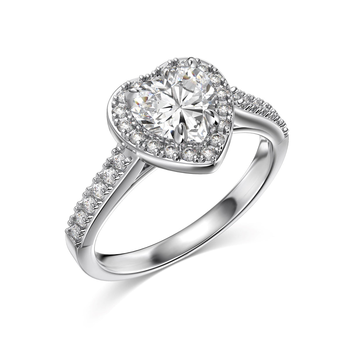 Argento 925 doppia rodiatura.Moissanite certificata GRA taglio cuore 6.5x6.5mm. Clarity: VVS1; Color: D; Cut Grade: Excellent.Pietre sulla fascia e sul contorno: cubic zirconia di qualità 5A.