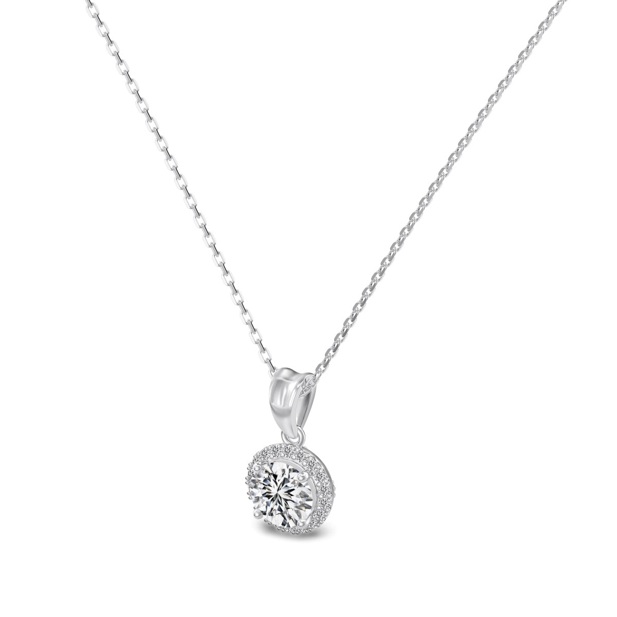 Argento 925 rodiato.Pietra centrale cubic zirconia taglio tondo di qualità 5A;Pietre a contorno cubic zirconia taglio tondo di qualità 5A.Lunghezza 40+5cm di allungo.