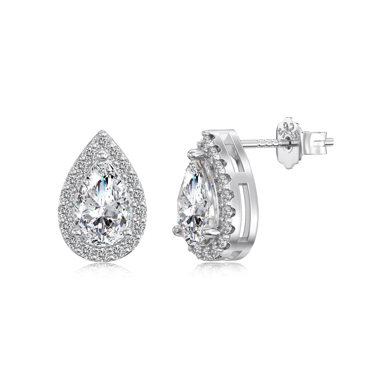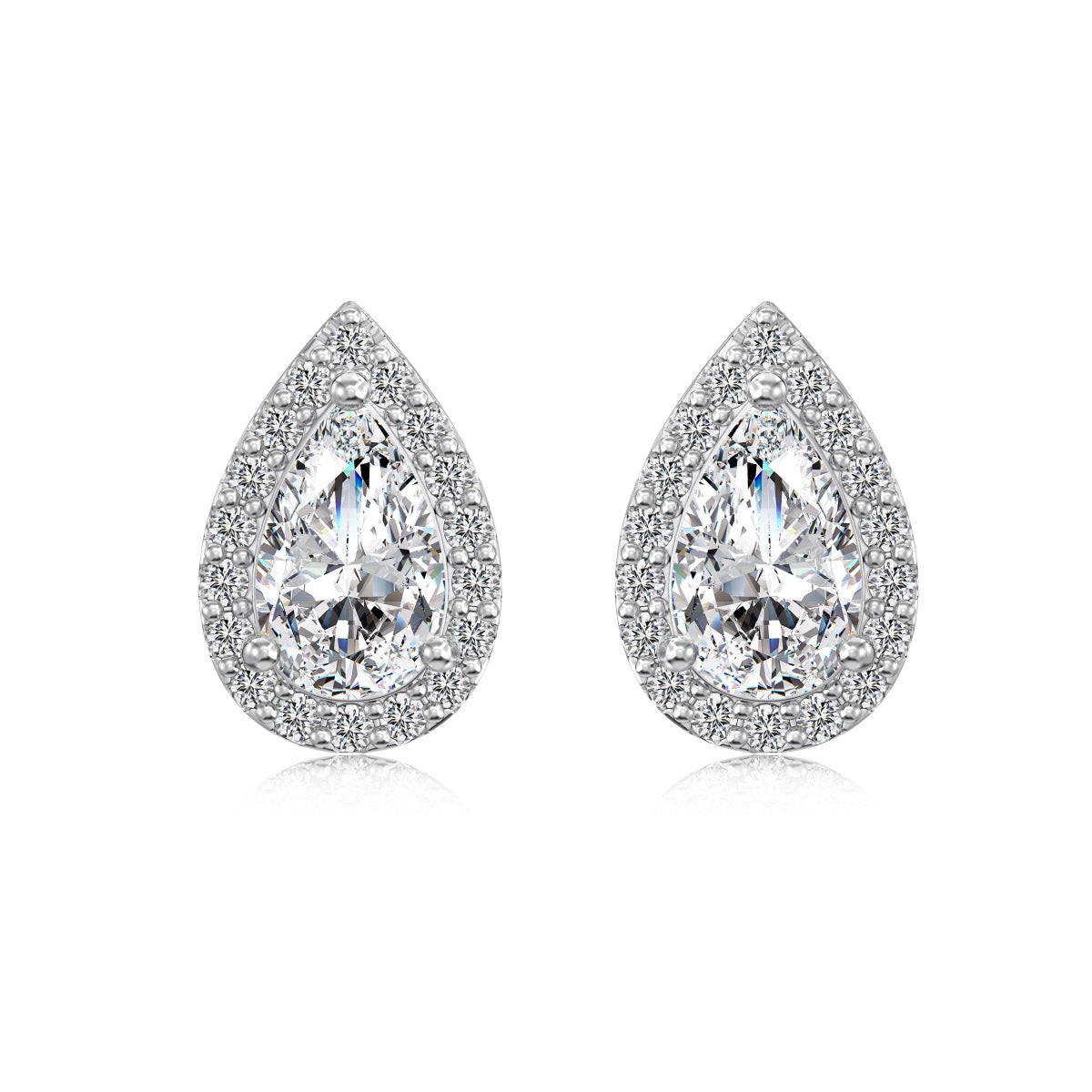 Argento 925 rodiato.Pietra centrale cubic zirconia taglio goccia di qualità 5A;Pietre a contorno cubic zirconia taglio tondo di qualità 5A.